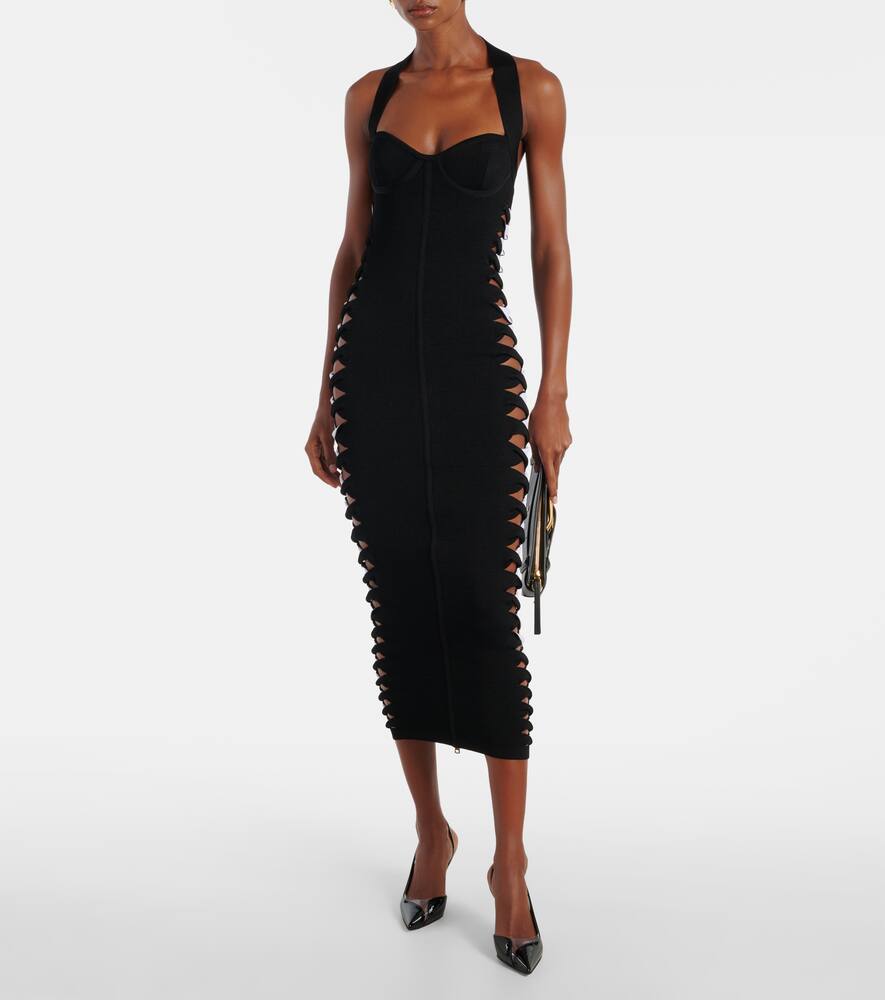 Оливье Рустен вдохнул новую жизнь в Balmain, отдавая дань уважения кутюрному наследию дома и сочетая его с современными тенденциями. Это платье миди из джерси с вырезами и соблазнительным халтер-лифом.