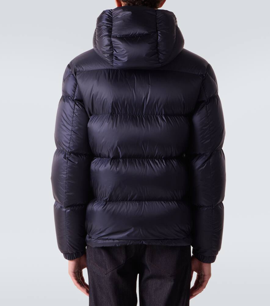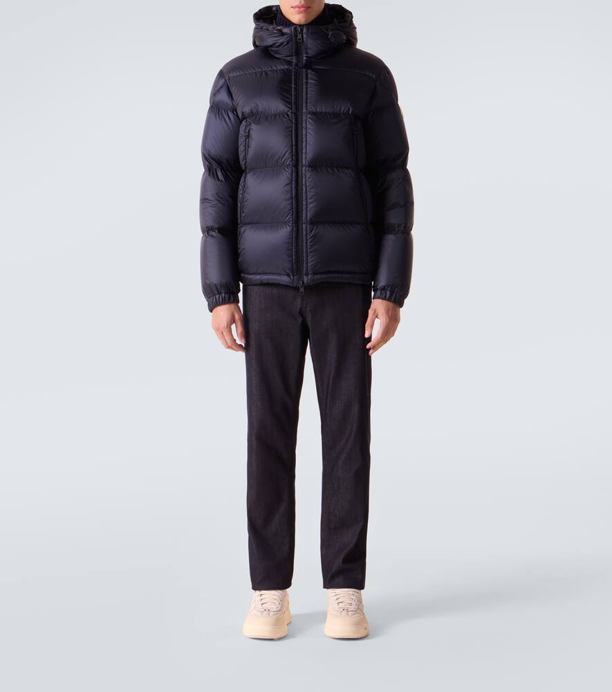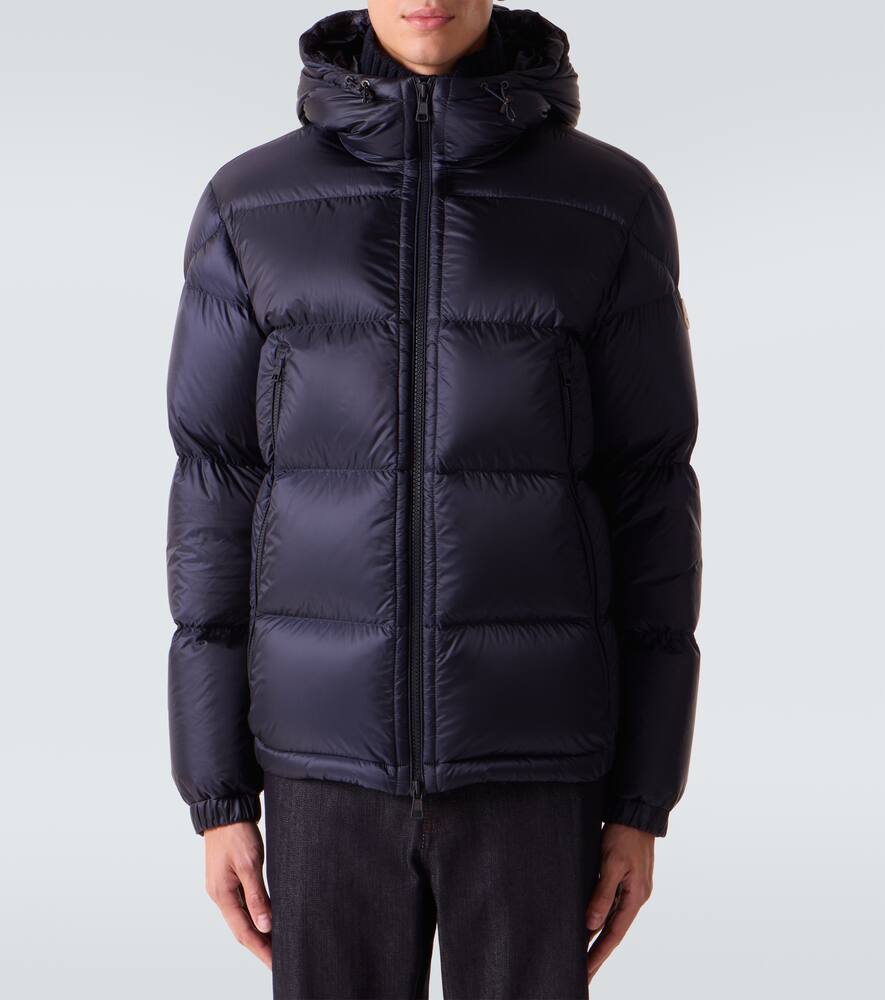 Пуховик Rivau выполнен из блестящей технологичной ткани. В истинном стиле Moncler он отличается стёганой отделкой, нашивкой с логотипом на одном рукаве и ребристым воротником с уютным капюшоном по бокам.