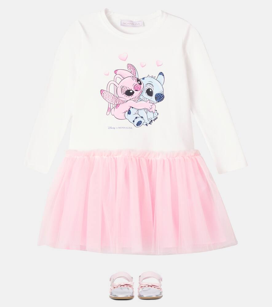 Это совместное платье Disney и Monnalisa посвящено любимым персонажам мультфильма Стич. Это очаровательное платье из тюля и хлопкового джерси украшено ярким принтом и сверкающими драгоценными камнями.