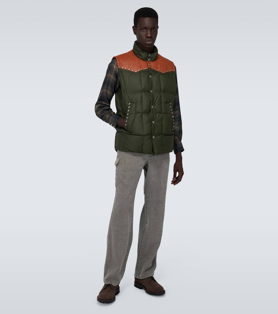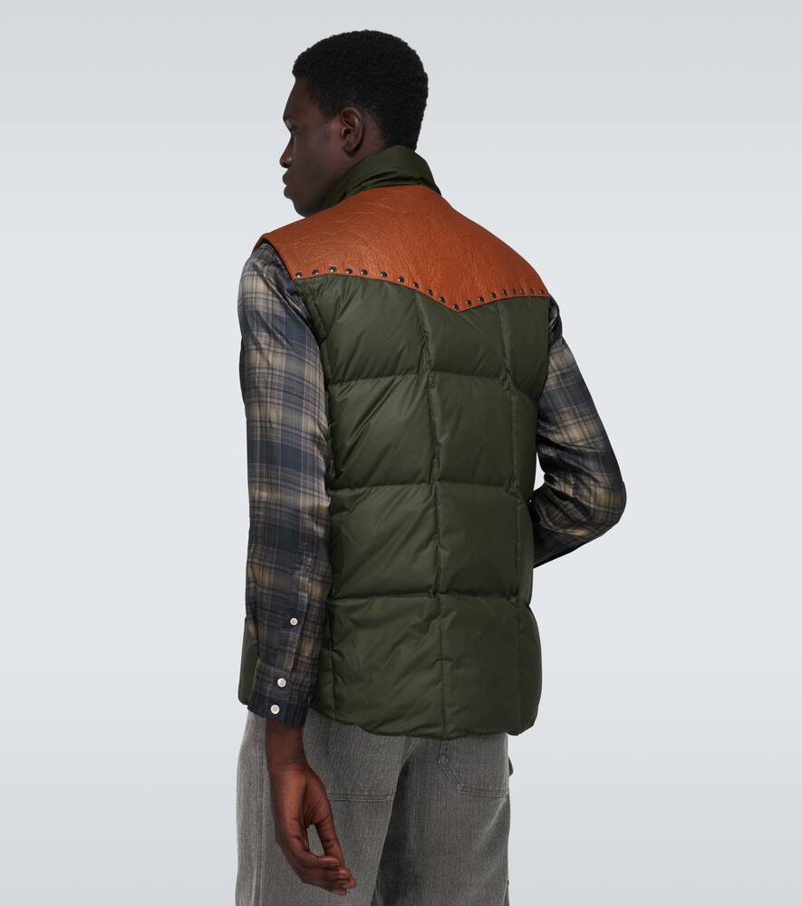 Этот пуховый жилет от PHIPPS с контрастной фактурной плечевой вставкой изготовлен в Италии из технической ткани зеленого цвета, имеет детали с серебряными заклепками на груди и прорезные карманы по бокам.
