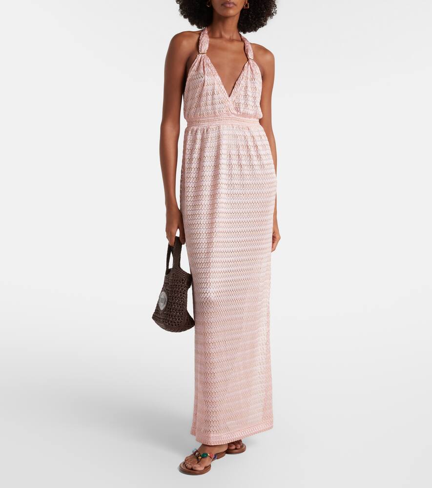 Длинное платье Mariah от Melissa Odabash легко перейдет от повседневного образа после купания до элегантных коктейльных вечеринок. Это платье из полупрозрачной розовой ткани ламе с вырезом халтер и высоким разрезом сбоку.