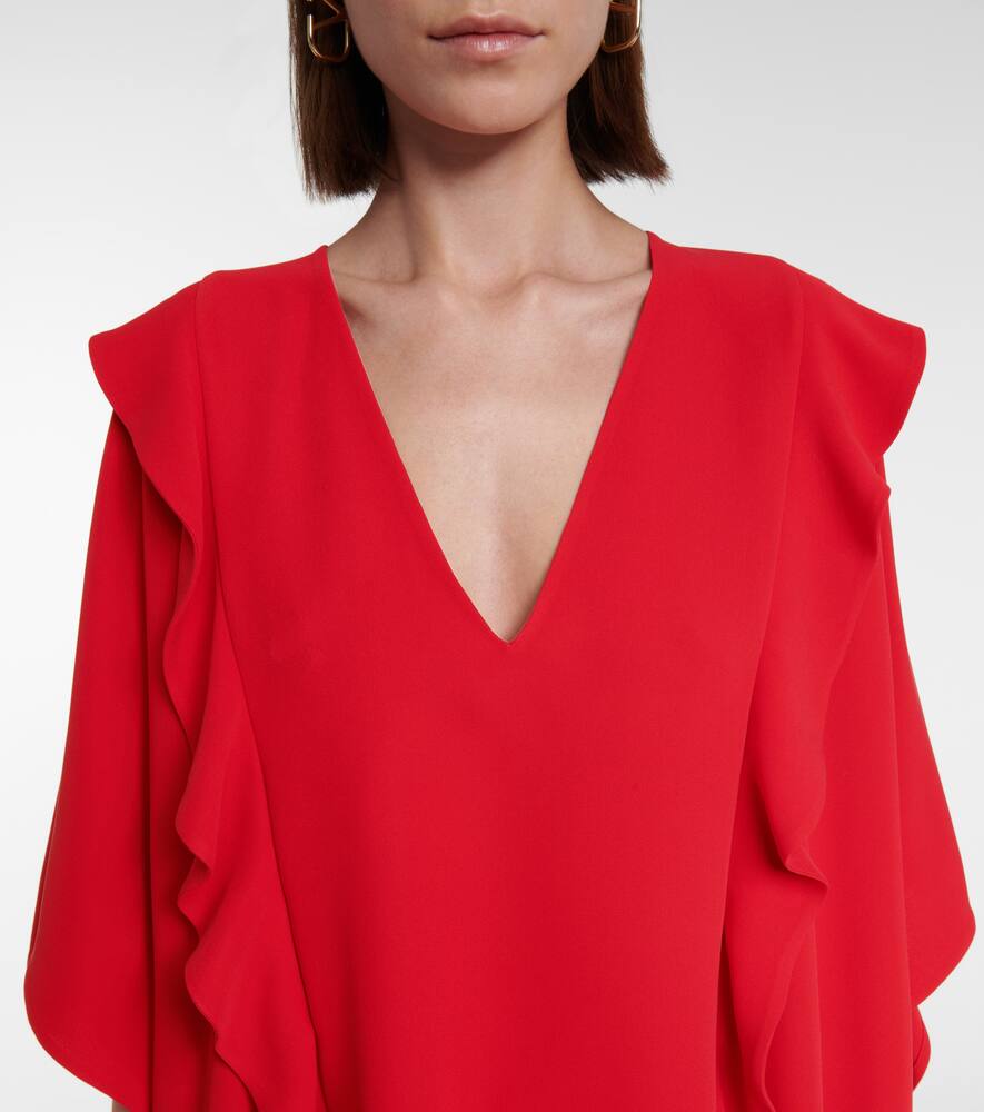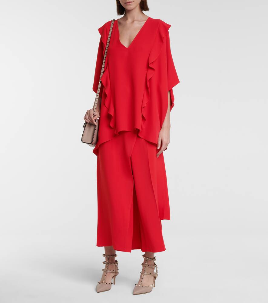 Воздушные силуэты, подобные тому, что представлен на этой блузке, — ключевой элемент гардероба поклонницы Valentino. Эта алая модель, типичная для романтического итальянского дома моды, выполнена из шёлкового крепа с красивой драпировкой, которая ещё больше подчёркивает рукава-кейпы. Глубокий вырез горловины обрамляет золотистое колье VLOGO.