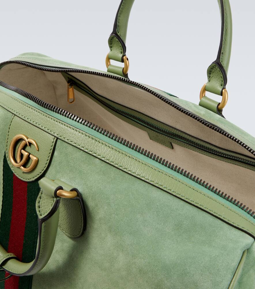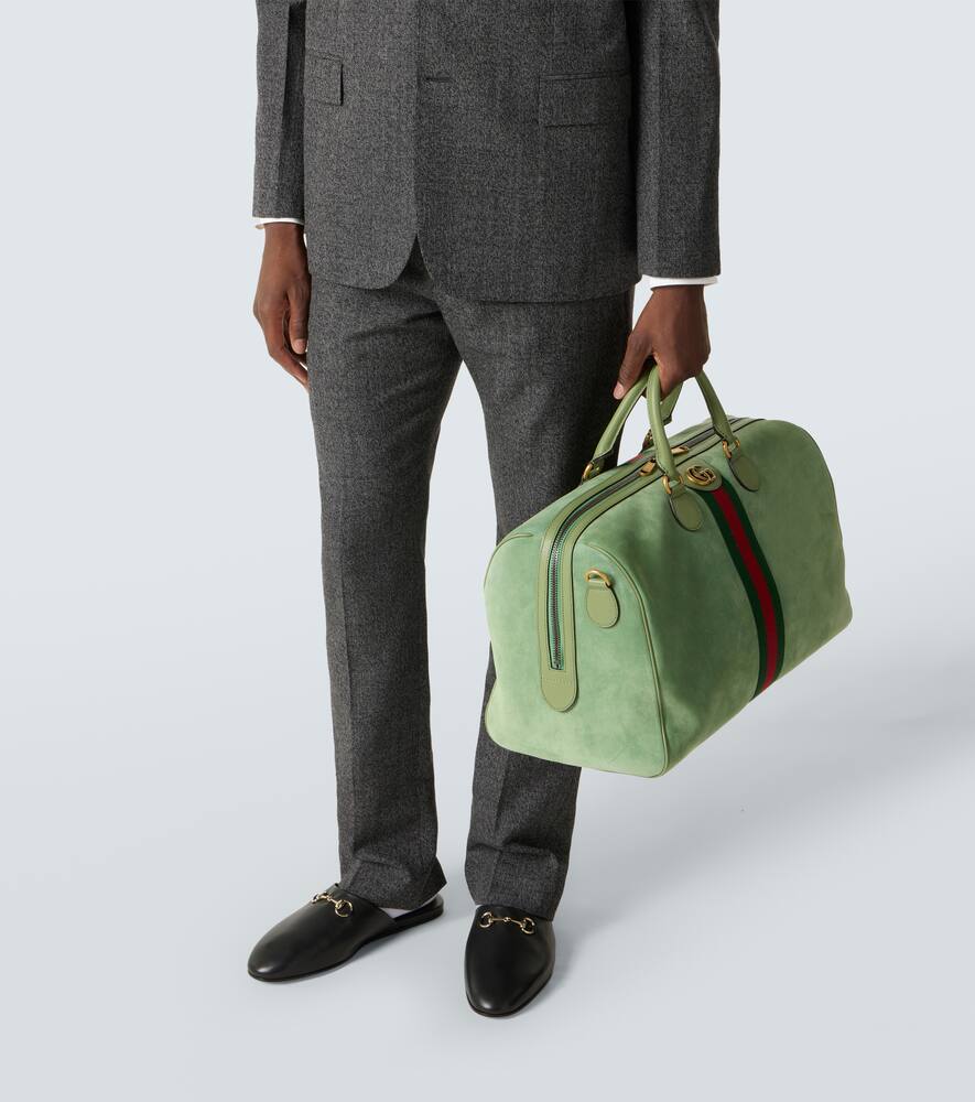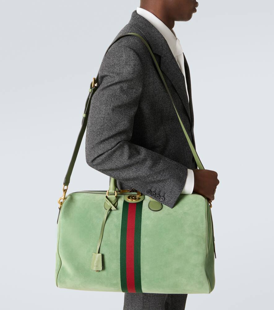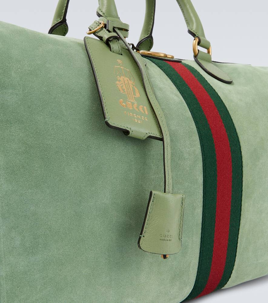 Дорожная сумка Gucci Savoy Medium изготовлена искусными итальянскими мастерами из гладкой замши с фирменной фурнитурой GG и полосатым мотивом. Фирменная зелёно-красная полоска Web, впервые представленная Gucci в 1951 году, была вдохновлена ремнями конных седел.