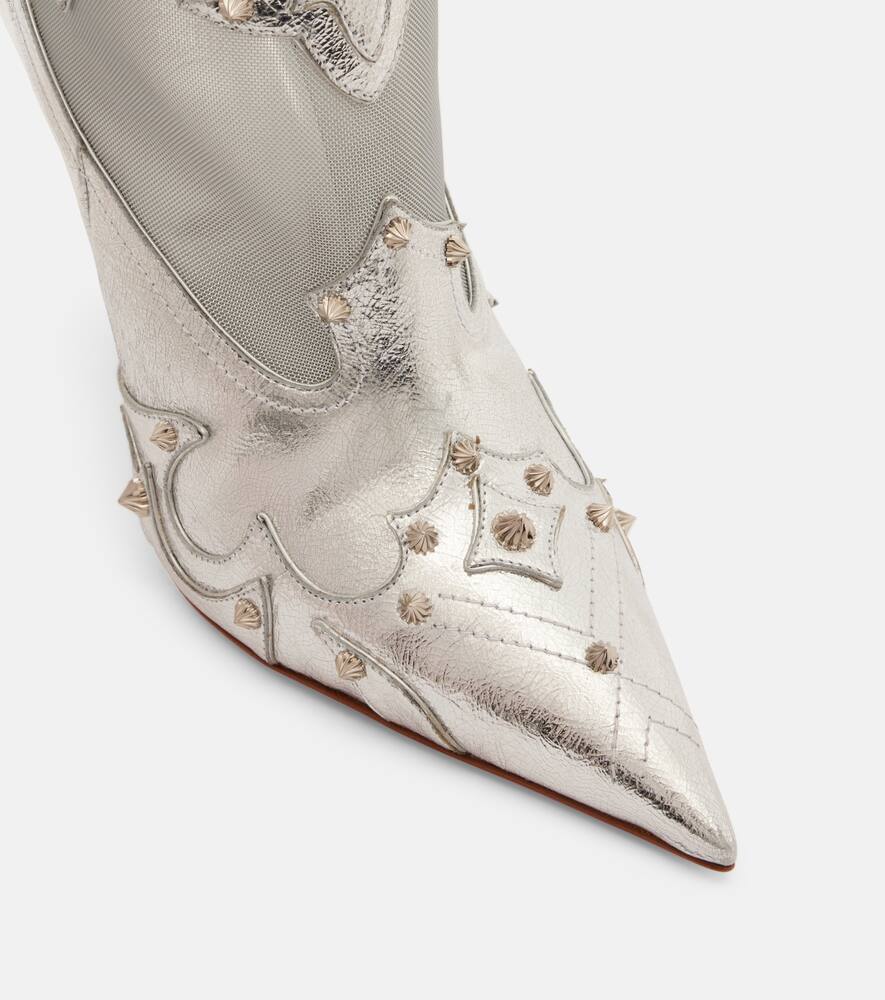 Эти эффектные ботильоны от Christian Louboutin выполнены из кожи серебристого металлического оттенка и украшены сетчатыми вставками. Модель украшена декоративными элементами, имеет шпильку и острый нос.