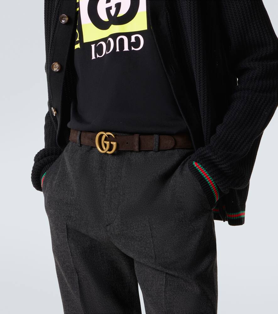 Ремень GG Marmont изготовлен в Италии из мягкой замши и дополнен фирменной пряжкой в виде двойной буквы G. Этот классический дизайн добавит изысканный акцент классического стиля как джинсовым, так и классическим образам.