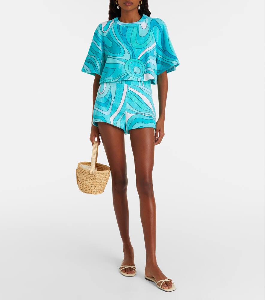 Этот мягкий укороченный топ из хлопкового махрового полотна украшен узором Iride. Этот культовый психоделический вихревой мотив стал визитной карточкой бренда, благодаря которому Pucci получил титул Принца принтов.