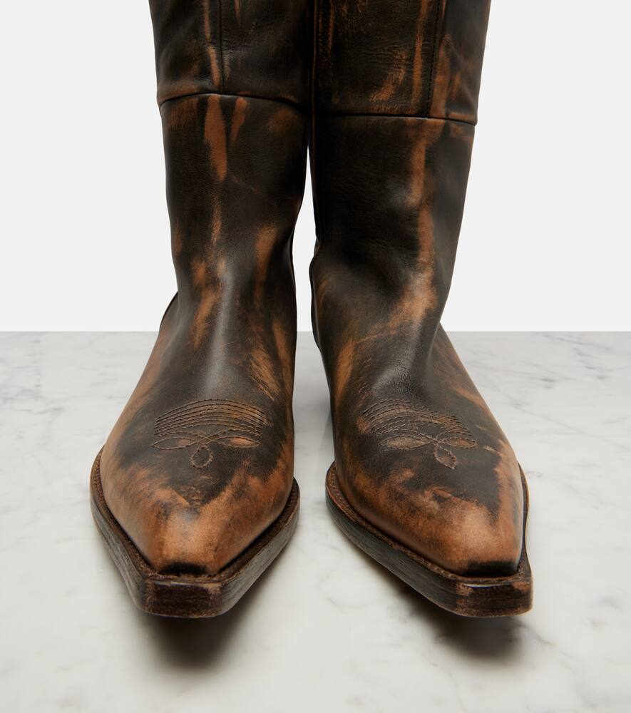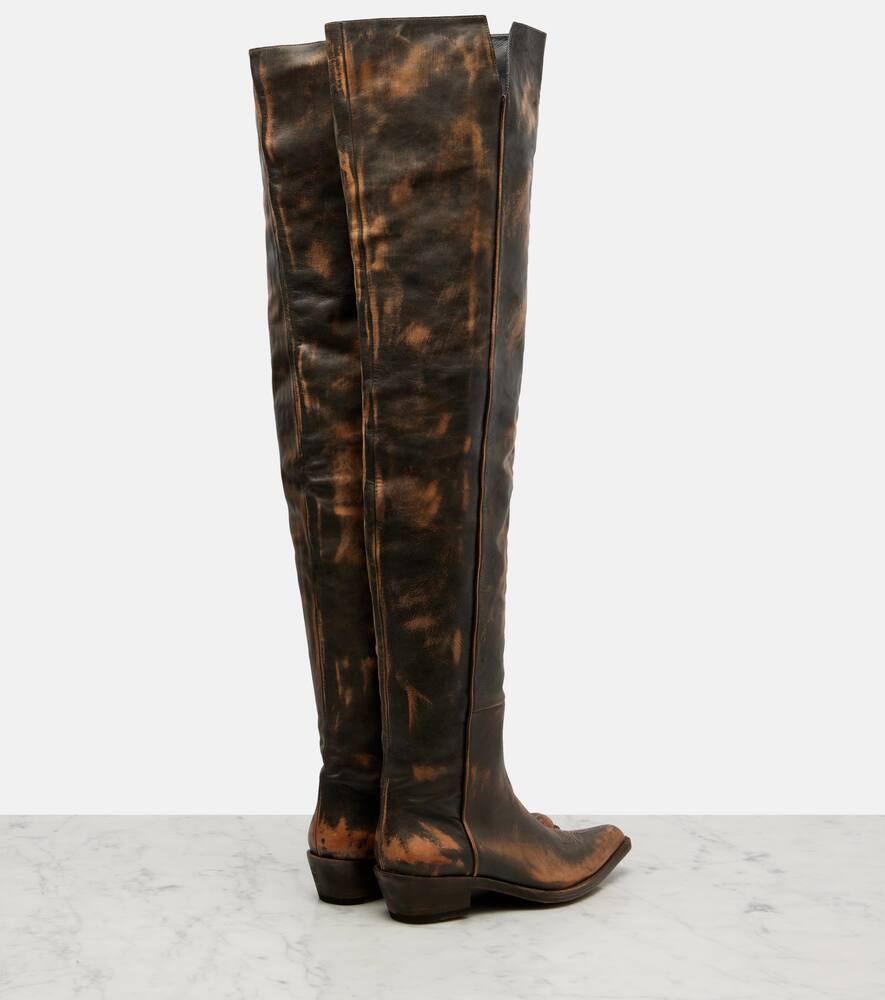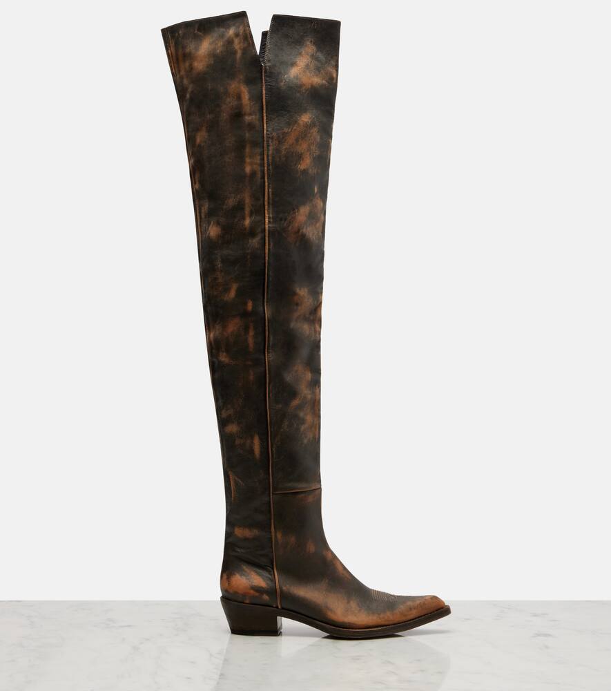 Минималистичный дизайн Khaite воплощает современную изысканность и непринужденную элегантность. Ботфорты Clive изготовлены из состаренной кожи и оснащены очень тонким каблуком высотой 35 мм.