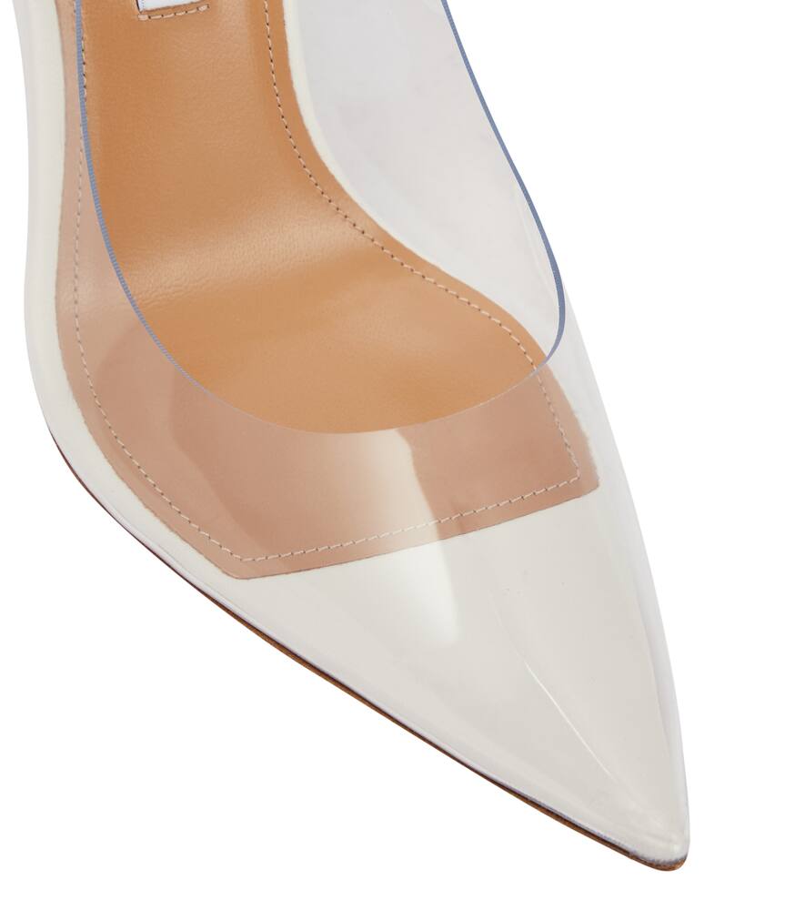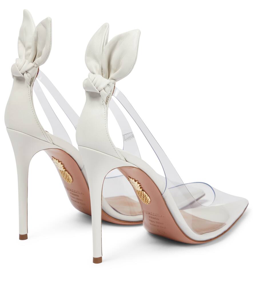 Aquazzura представляет новую версию своих культовых туфель-лодочек Bow Tie Plexi с белой отделкой для вашего важного дня. Туфли из полупрозрачного ПВХ имеют классический острый нос и каблук-шпильку, дополненные вырезами по бокам и кожаными бантами.