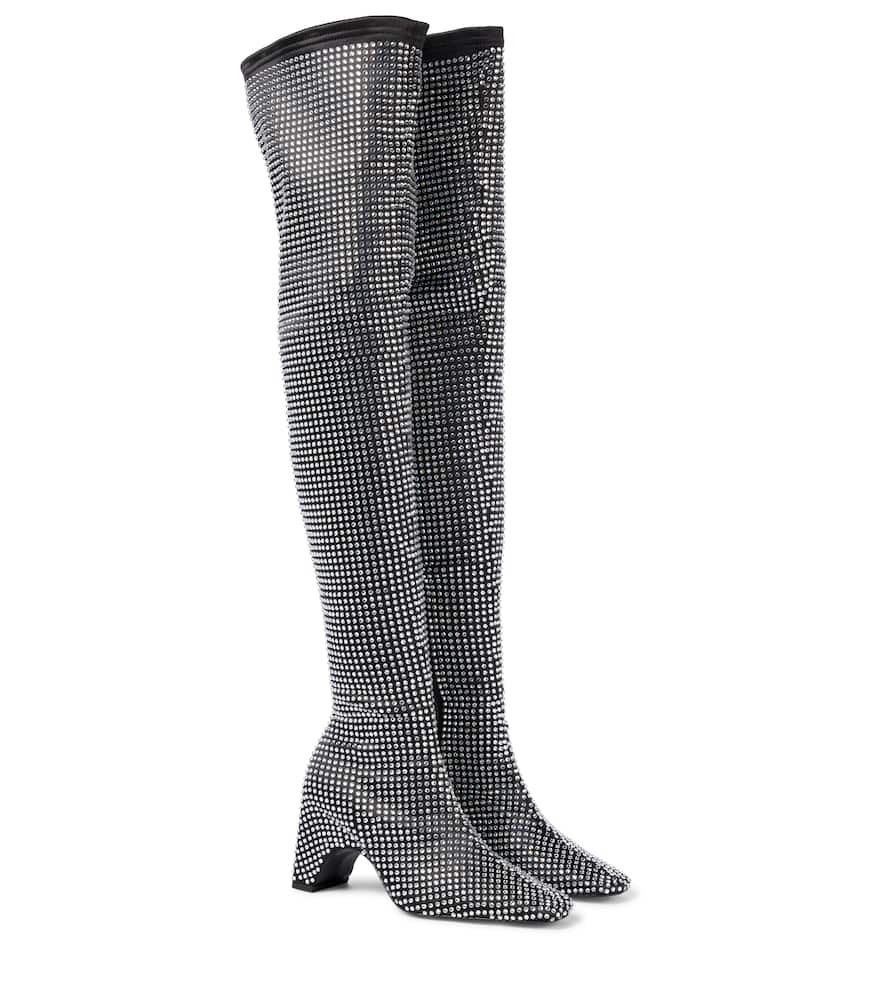 Ботфорты Coperni с отделкой станут изюминкой любого ансамбля. Сделанные в Испании из эластичной искусственной кожи чёрного цвета, они на скошенном блочном каблуке и полностью покрыты кристаллами. Это вершина гламура, способная превратить любой образ в праздничный.