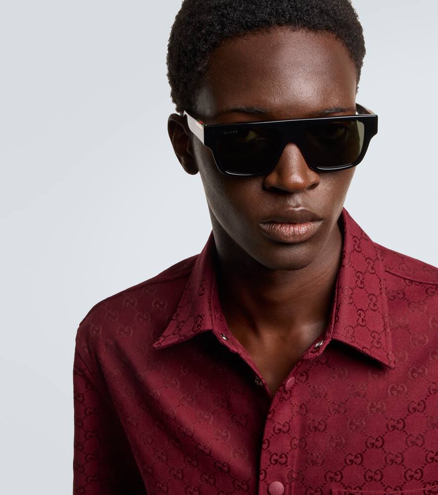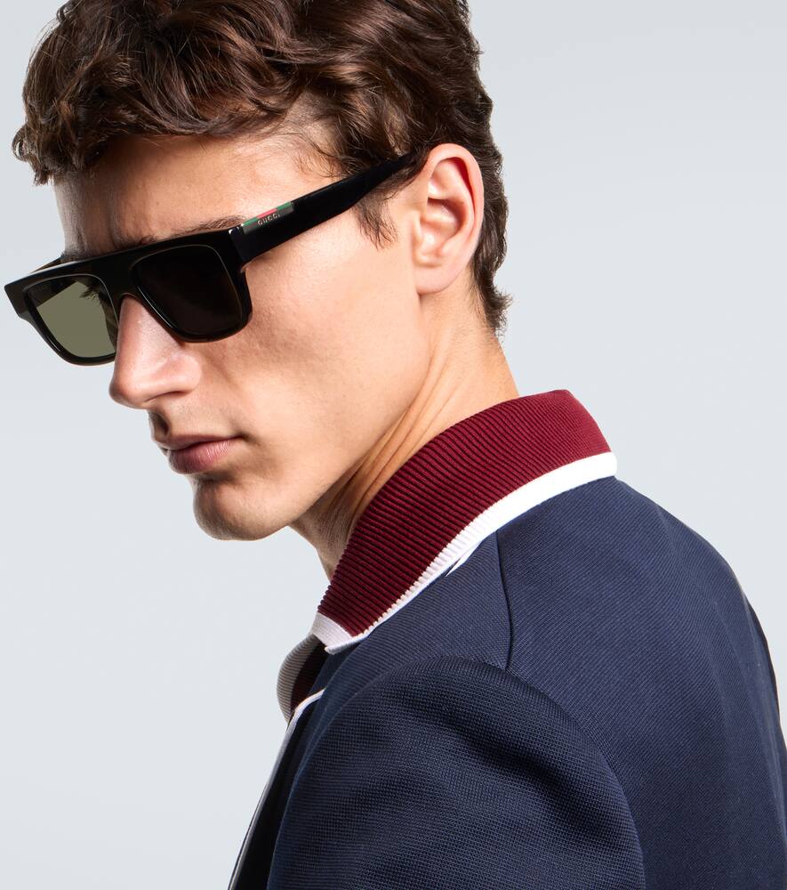 Эти солнцезащитные очки с плоской верхней частью имеют чёрную ацетатную оправу, тёмно-серые тонированные линзы и культовый мотив бренда на заушниках. Фирменная зелёно-красная полоса Gucci Web Stripe, дебютировавшая в 1951 году, была вдохновлена ремнями конных седел.