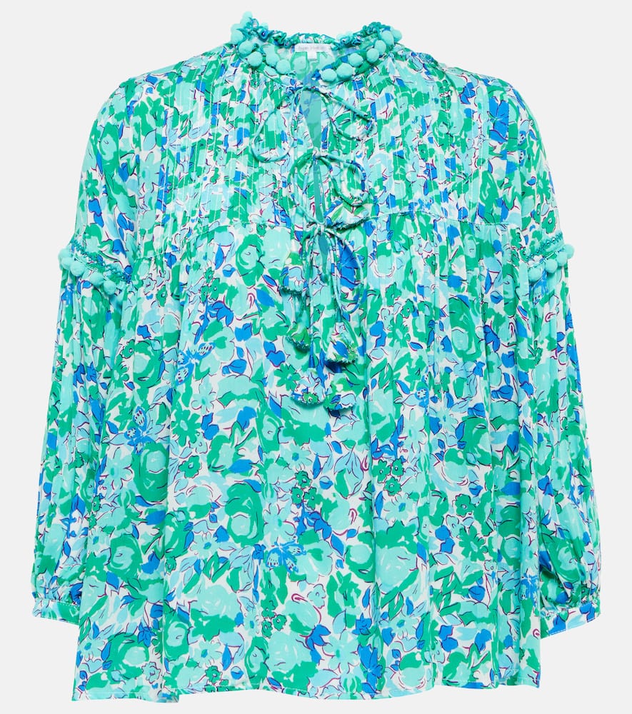 Зелёная блузка Clara от Poupette St Barth, эксклюзивно представленная в Mytheresa, идеально подходит для отдыха в тёплую погоду. Она украшена лёгким цветочным принтом, фирменным присборенным вырезом и плиссированными рукавами-фонариками.