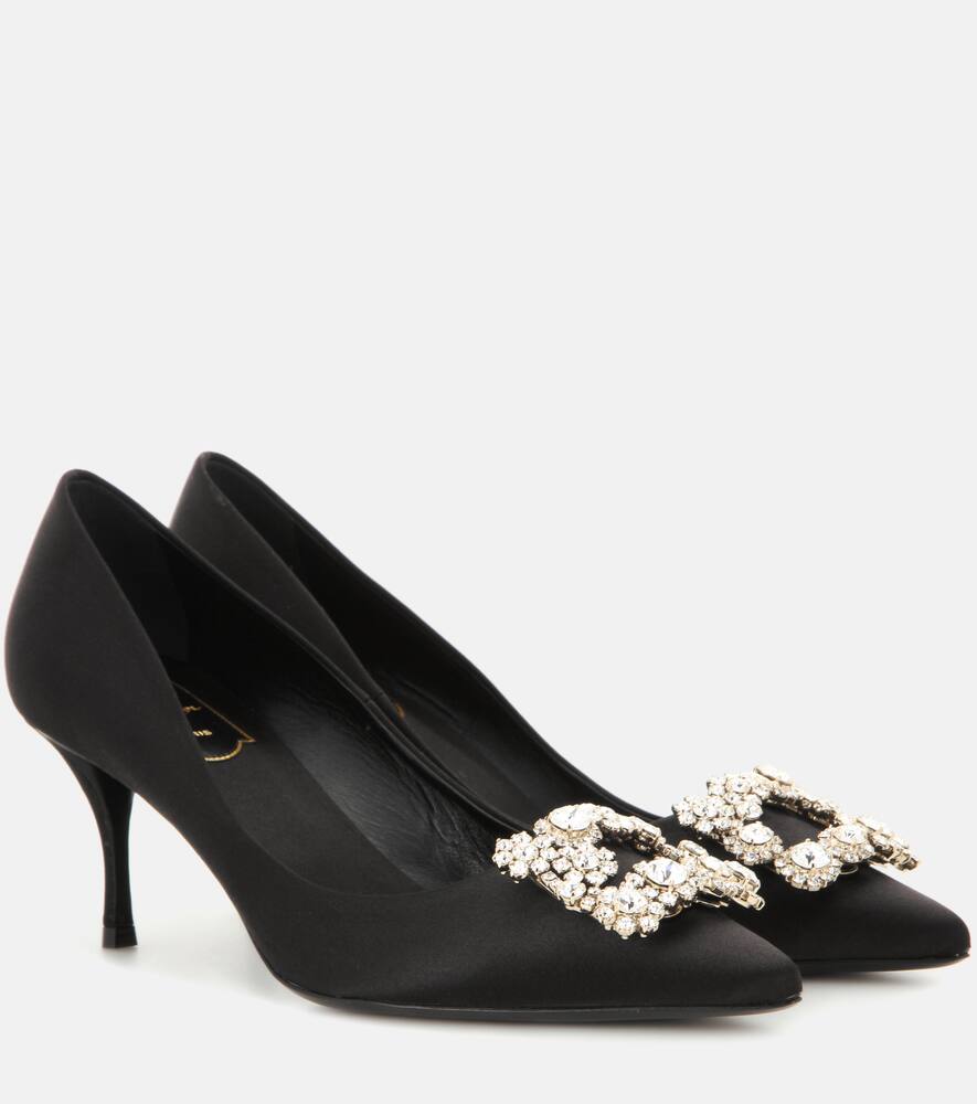 Отдайте предпочтение ультрароскошному силуэту с чёрными атласными туфлями Roger Vivier. Они дополнены кокетливым каблуком-рюмочкой и украшены пряжкой с мерцающими кристаллами на поясе — идеальный способ добавить образу мерцающий эффект.