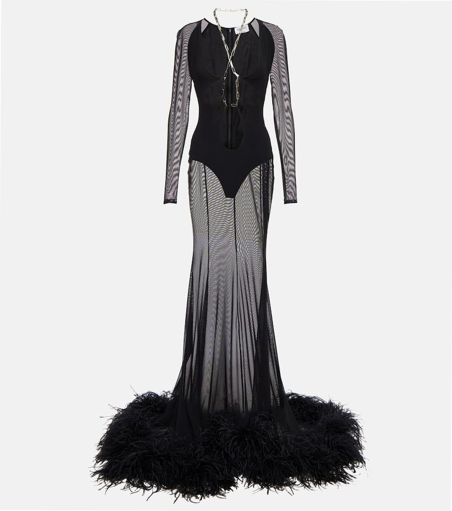 Это платье от The Attico, сделанное в Италии, выполнено из лёгкой прозрачной ткани и имеет облегающий силуэт с струящейся юбкой макси. Полностью чёрный дизайн дополняется смелыми вырезами и блестящей фурнитурой на лифе, а также отделкой из мягких перьев.
