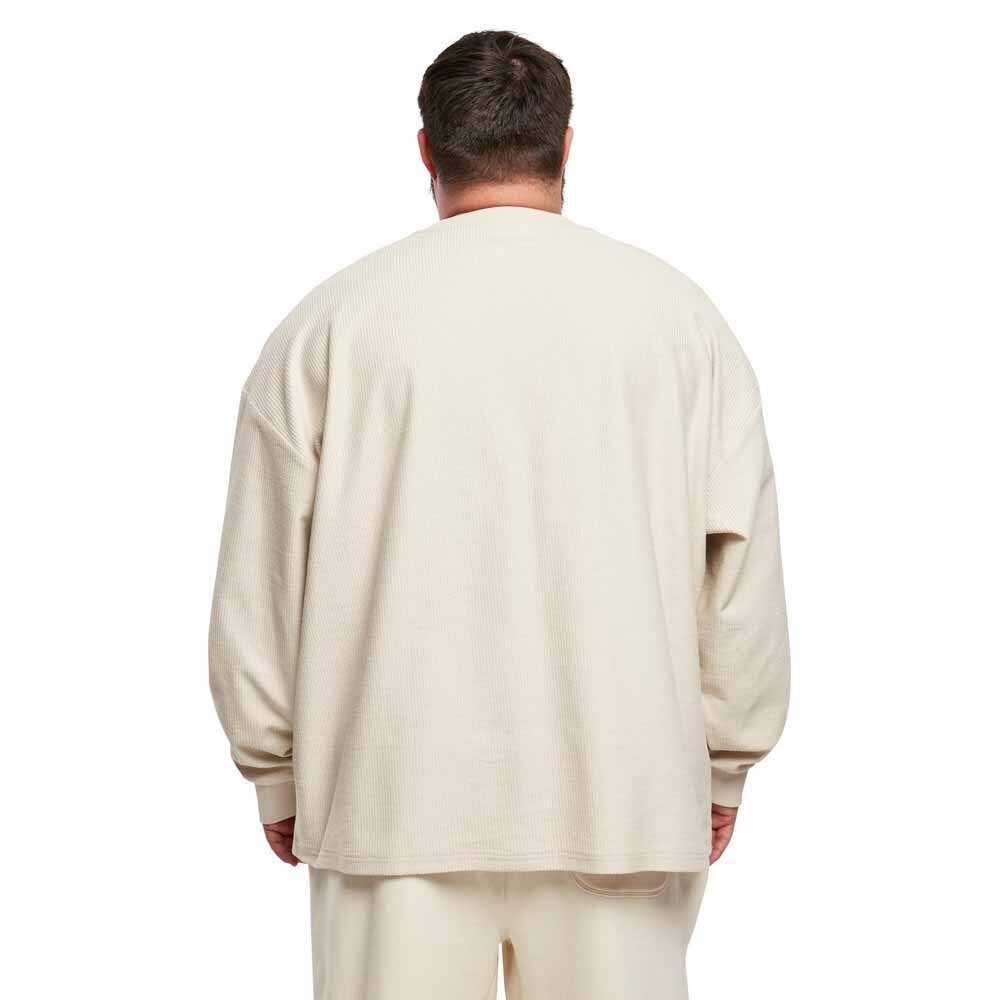 Эта непринужденная мужская рубашка с длинным рукавом воплощает в себе идеальную небрежность, реализованную благодаря широким заниженным плечам, модному свободному крою и высококачественной махровой хлопчатобумажной ткани в рубчик. Ярко выраженный круглый вырез и широкие манжеты дополняют городской стиль.