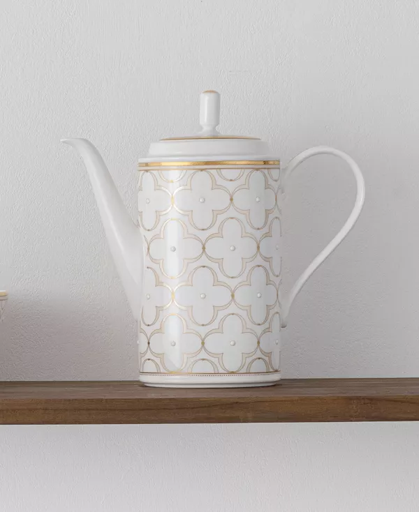 Trefolio Gold украшен повторяющимся стилизованным узором в виде четырёхлистного клевера, представленным в разных размерах на разных изделиях для максимального эффекта. Крупный рисунок дополнен рельефными эмалевыми точками. Мягкие оттенки белого и кремового в сочетании с золотом делают этот узор доступным и уместным в любом интерьере. Золотое кольцо. Костяной фарфор. Можно мыть в посудомоечной машине.