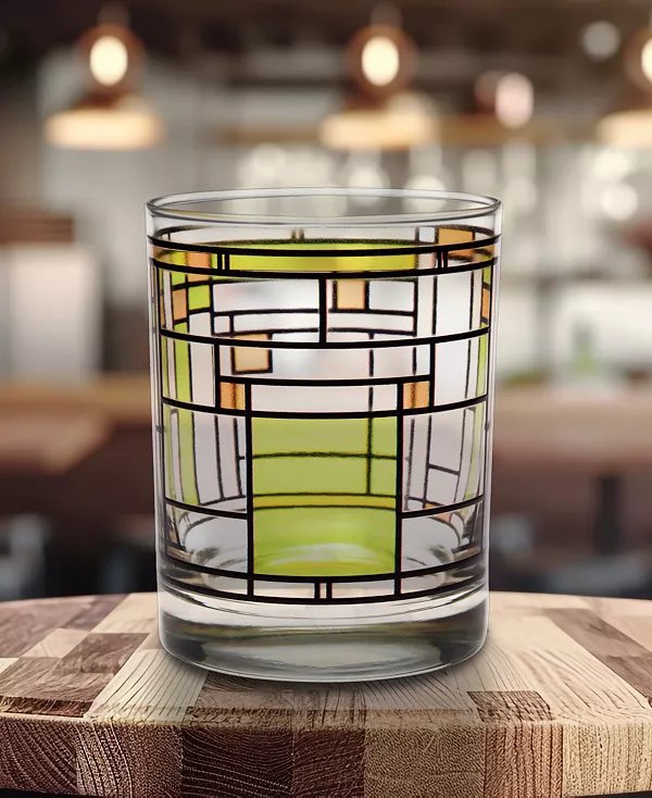 Официально лицензированный дизайн Фрэнка Ллойда Райта в Оук-Парке. Вдохновением для создания этого витражного дизайна этого стакана послужила домашняя студия Фрэнка Ллойда Райта в Оук-Парке, штат Иллинойс.
