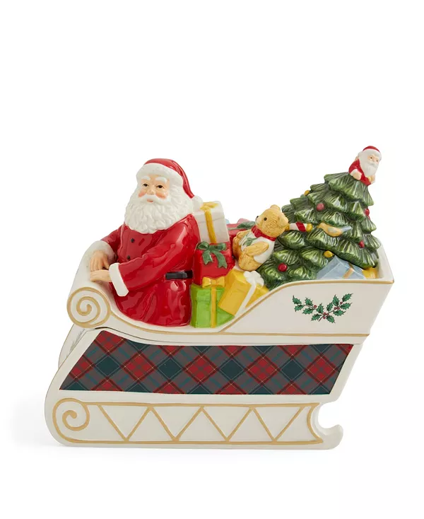 Эта красивая банка для печенья в форме саней Санты, украшенных клетчатой тканью и падубом, представляет собой сани, полные подарков. Эта банка с Санта-Клаусом у руля идеально подходит для хранения праздничных угощений, а также станет волшебным украшением стола или фуршета.