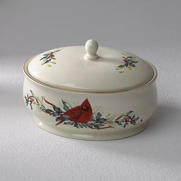 Подавайте запеканки, гарниры и другие блюда в этом праздничном керамическом блюде. Дружелюбная птица красный кардинал, сидящая на ветке, приглашает гостей насладиться вкуснейшим угощением. Блестящая отделка из 24-каратного золота.