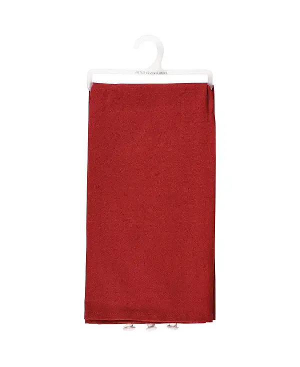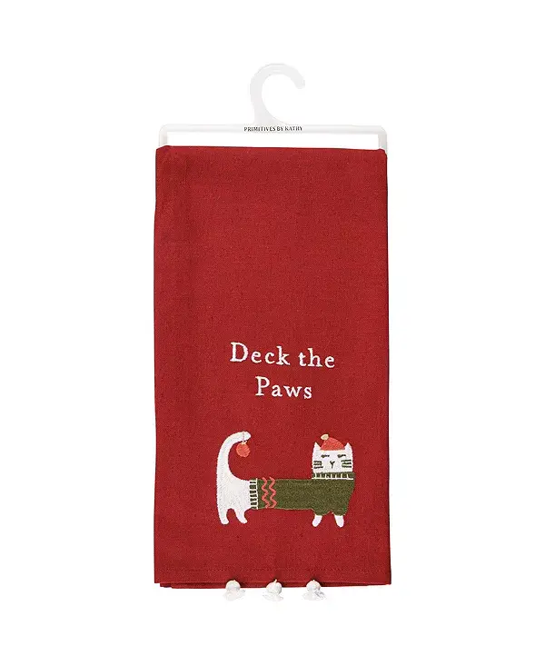 Красное кухонное полотенце из хлопка и льна с изображением кота в рождественском свитере с украшением на хвосте под забавной надписью «Укрась лапки» на тему домашних животных. Узоры полностью вышиты и украшены белыми кисточками для дополнительной привлекательности. Забавный кухонный аксессуар с тематикой домашних животных, идеально подходящий для сезонного использования.