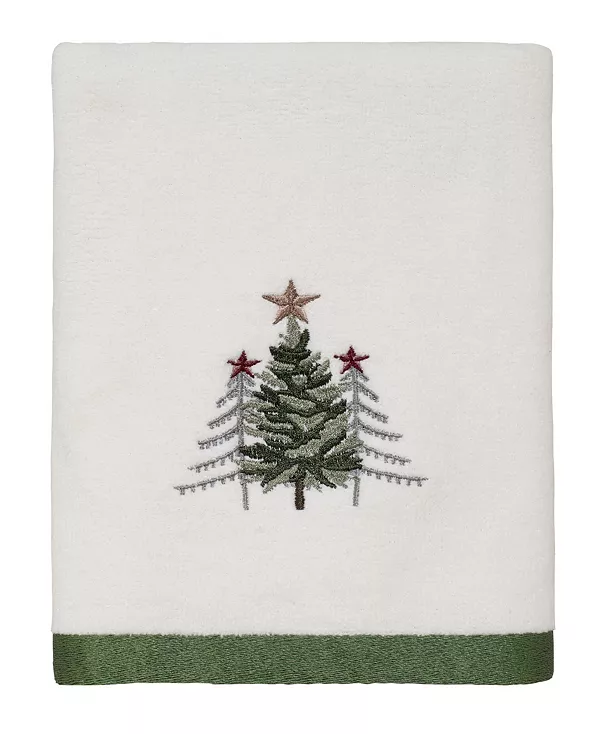 Банное полотенце Avanti Trees украшено тремя вышитыми соснами контрастных оттенков зеленого с золотыми звездами на эксклюзивной отделке и белой велюровой окантовке. Полотенце дополнено зелёной полиэстеровой каймой того же цвета.
