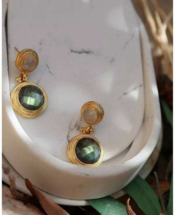 Текстурированные плетеные золотые формы и очаровательное сочетание драгоценных камней делают эти золотые серьги-подвески уникальным украшением для вашей коллекции. Эти серьги-гвоздики, вручную украшенные белым халцедоном и лабрадоритом, добавят нотку повседневной элегантности любому образу.