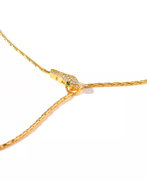Ожерелье Viper Y Drop идеально впишется в ваш образ. Это ожерелье, украшенное изображением змеи с изумрудными глазами, станет ярким акцентом и позволит вам почувствовать себя настоящей хозяйкой. Благодаря передней застёжке, которая придаст вашему образу ещё больше шика, это идеальный аксессуар, если вы хотите добавить немного пикантности.