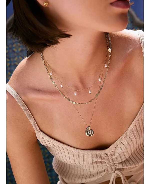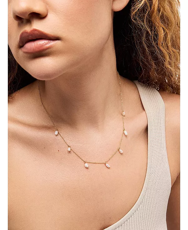 Это шикарное летнее золотое жемчужное ожерелье, покрытое 14-каратным золотом, украшено свисающими пресноводными жемчужинами, которые идеально подойдут к любому вырезу.