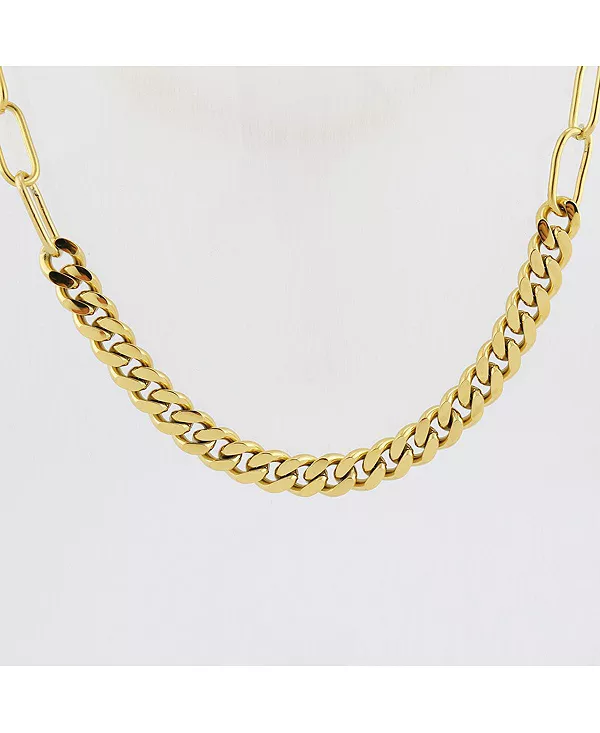 Длина этого ожерелья составляет 18 дюймов с удлинителем 2 дюйма. Оно изготовлено из нержавеющей стали с 18-каратным золотом.
