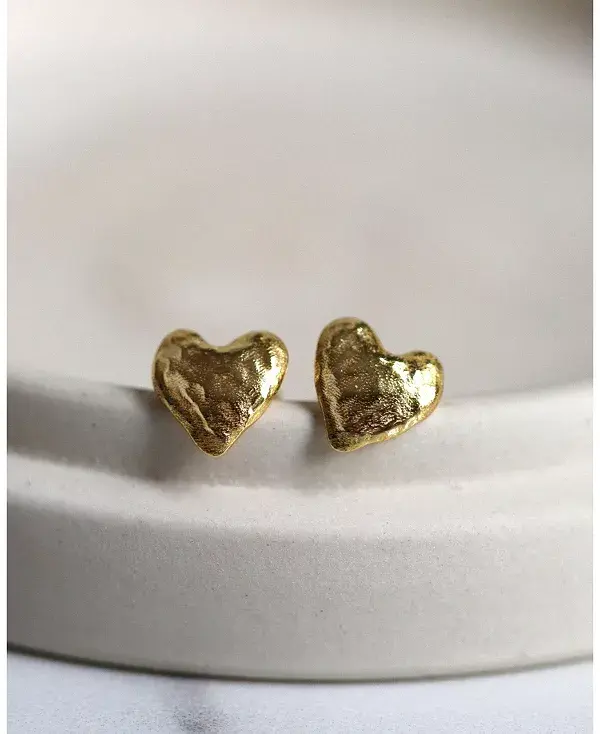 Эти серьги-гвоздики из стерлингового серебра с покрытием из 18-каратного золота отличаются лёгкой чеканкой, придающей их романтичной форме сердца изысканный вид. Символизируя любовь в современной интерпретации, они идеально подойдут в качестве подарка или для повседневного использования. Милое и значимое дополнение к любой шкатулке с драгоценностями.