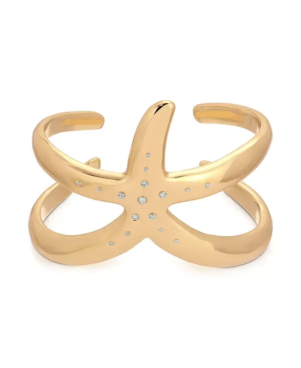 Браслет-манжета Starfish Luxe покрыта 18-каратным золотом и украшена россыпью миниатюрных кристаллов, сверкающих, словно звёздный свет. Универсальный дизайн позволяет изящно носить его как на запястье, так и на предплечье, добавляя нотку прибрежного шика любому образу.