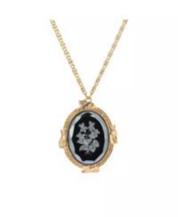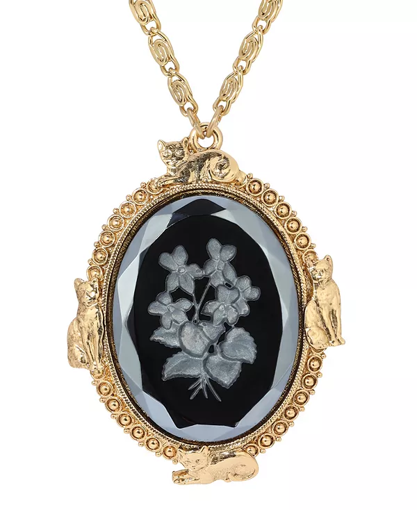 Этот потрясающий овальный кулон воплощает грацию кошачьих: в каждом углу изящно расположилось по кошке. Эффектный чёрный стеклянный камень с замысловатой гравировкой в виде цветущего цветка служит центральным элементом, добавляя нотку элегантности и очарования.