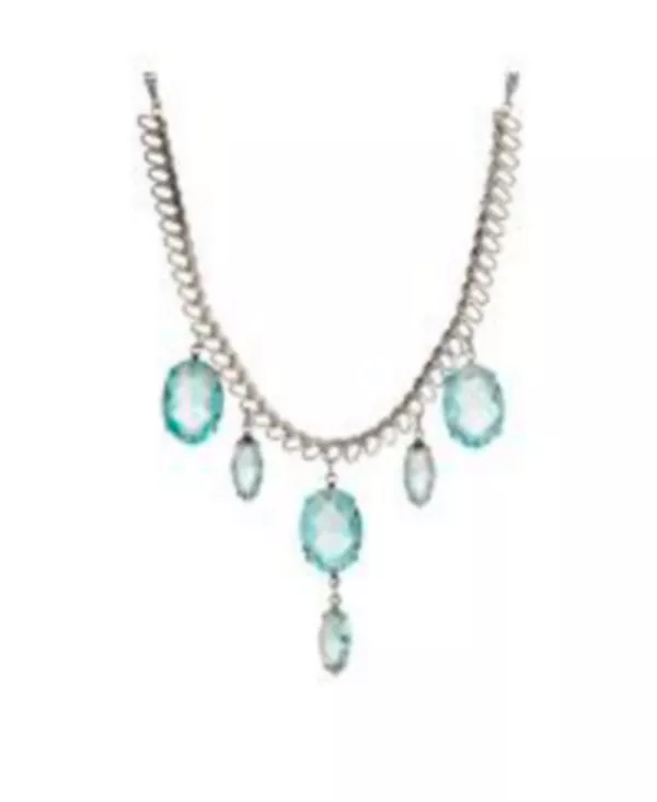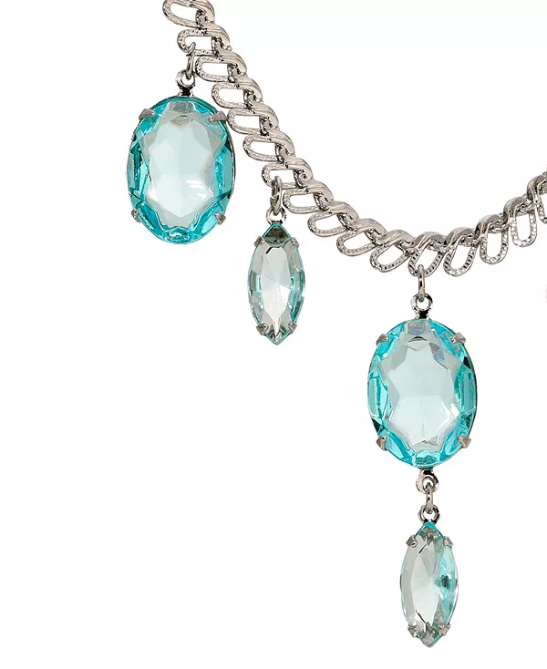 Это ожерелье отличается уникальным сочетанием аквамариновых стеклянных кристаллов в форме навета и овальных аквамариновых кристаллов, которые добавят изысканности любому наряду. Контраст холодного серебра с яркими синими кристаллами создаёт поразительный визуальный эффект, который непременно привлечёт внимание.