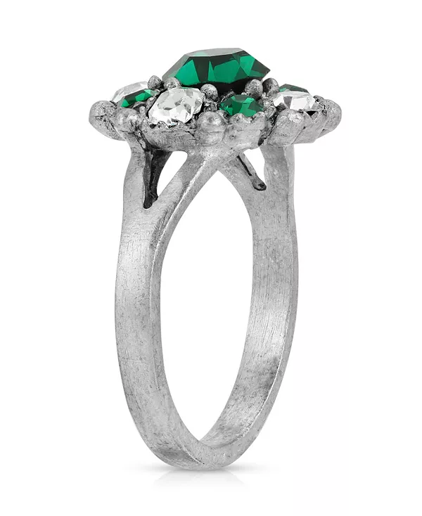 Элегантность в винтажном стиле. Это очаровательное и уникальное кольцо в форме цветка с тёмно-зелёными и прозрачными кристаллами в оловянной оправе.