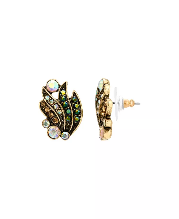 Мечтательные переливающиеся серьги-гвоздики в стиле ар-нуво, выполненные в античном золотом оттенке, с круглыми прозрачными кристаллами AB, акцентами в виде голубого северного сияния и топазового стекла.
