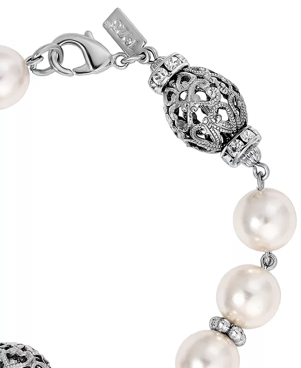 Этот браслет, изысканный по дизайну и идеально подходящий практически к любому наряду, украшен круглыми искусственными жемчужинами в сочетании с филигранными овальными бусинами-рондель.