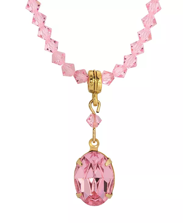 Это изысканное ожерелье украшено светло-розовым кристаллом в форме фонаря, изящно сочетающимся с овальным светло-розовым австрийским кристаллом. Изящное сочетание мягких оттенков и мерцающих граней создает романтичный и изысканный образ. Надёжная застёжка-бочонок сочетает в себе элегантность и удобство ношения.