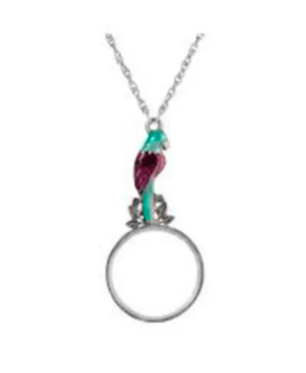 Подчеркните свой стиль с этим очаровательным 35-миллиметровым круглым стеклянным увеличительным стеклом с 1-2-кратным увеличением. На ожерелье изящно проработанный экзотический попугай, оживший благодаря эмалевой отделке вручную оттенками фиолетового и синего цирконов, добавит нотку экзотического очарования любому наряду.
