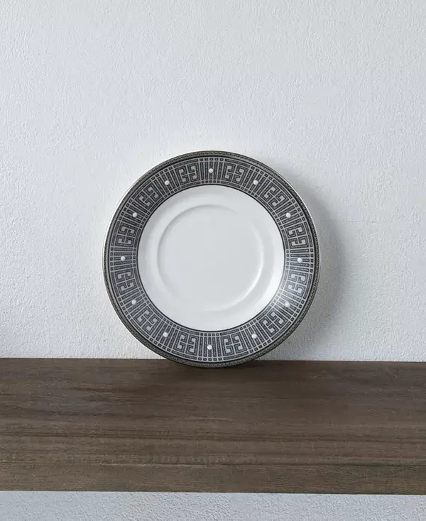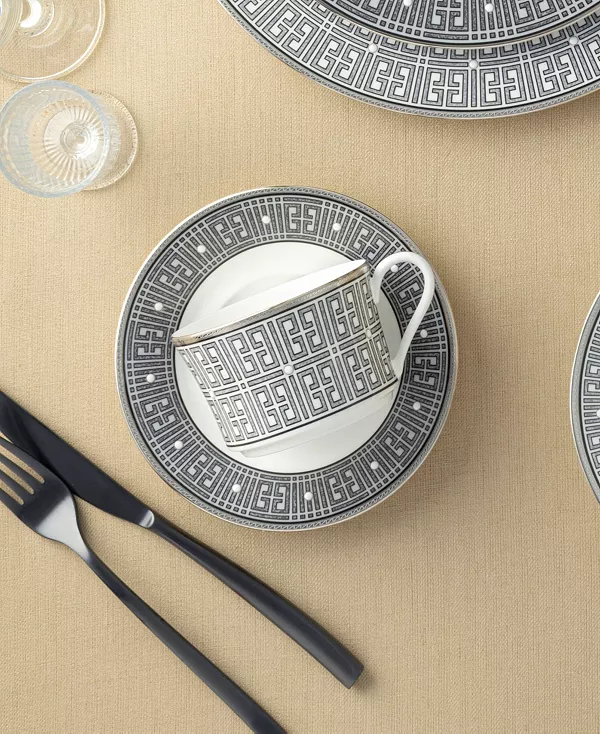 «Бесконечность» – эффектный узор на костяном фарфоре. Каждый предмет украшен узором в виде переплетающихся ключей и блоков. Внутри каждого блока находится мраморный рисунок в серо-коричневых тонах. Бронзовые изделия с символом «Бесконечность» украшены рельефными эмалевыми точками.
