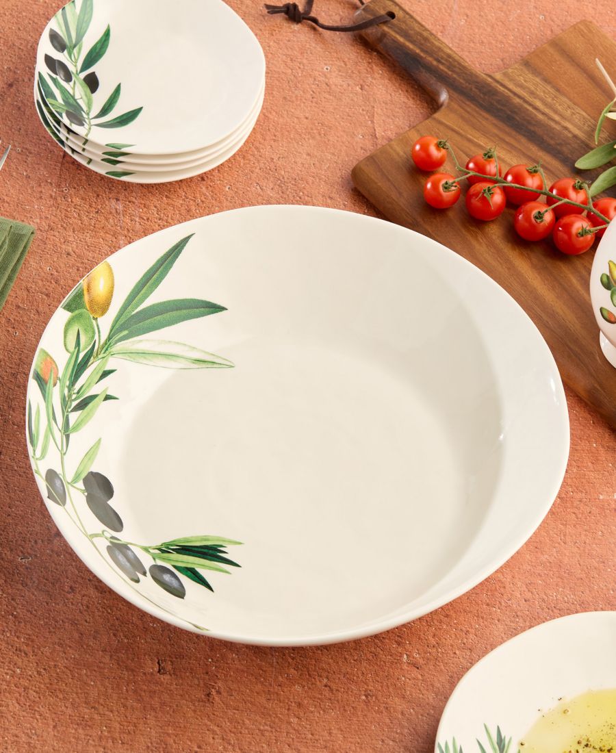 Эта миска имеет глянцевую поверхность, которая излучает изысканность и гарантирует долговечность. Принт в средиземноморском стиле с изображением оливковых ветвей, яркими зелеными листьями и насыщенными землистыми тонами создает вневременной дизайн, который добавит очарования и тепла любой сервировке стола. Независимо от того, принимаете ли вы гостей или наслаждаетесь непринужденной трапезой в кругу семьи, эта сервировочная миска станет функциональным и стильным дополнением к вашей коллекции посуды.