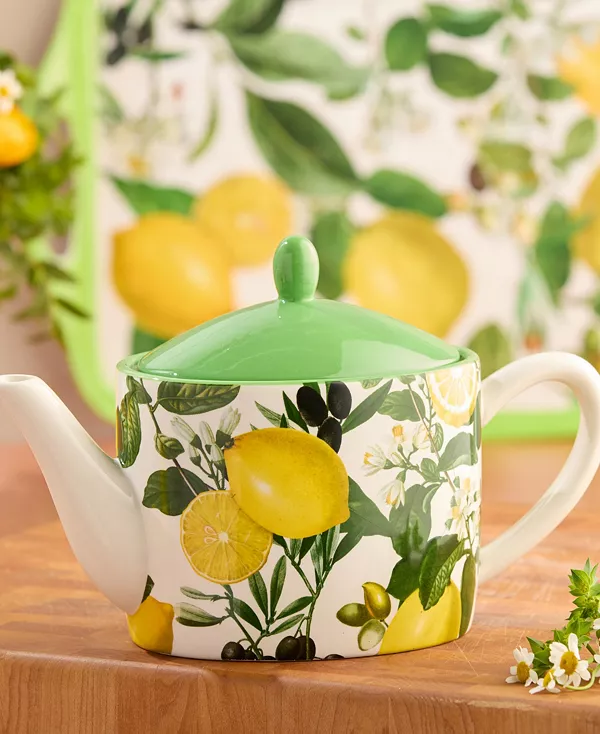 Очаровательный дизайн в средиземноморском стиле: чайник Limone, напоминающий ярко-жёлтый лимон, с зелёной ручкой, носиком и декоративным элементом в виде листочка, что добавит весёлой и элегантной нотки вашему чайному сервизу.