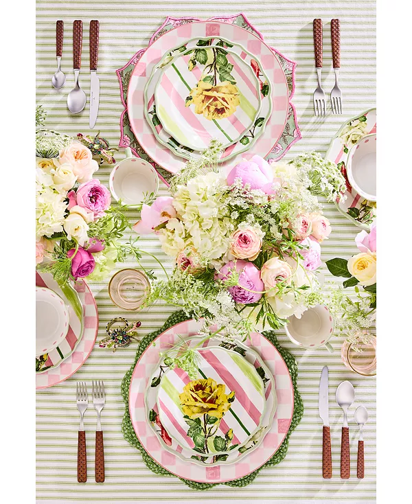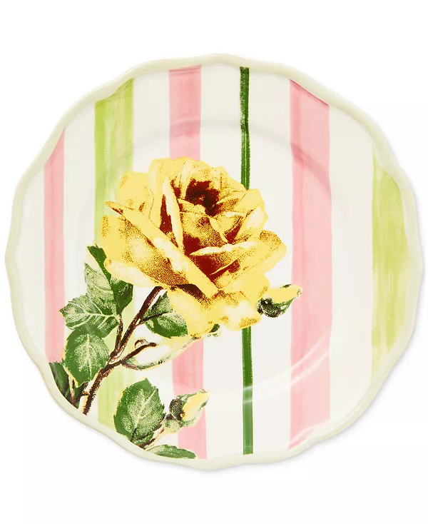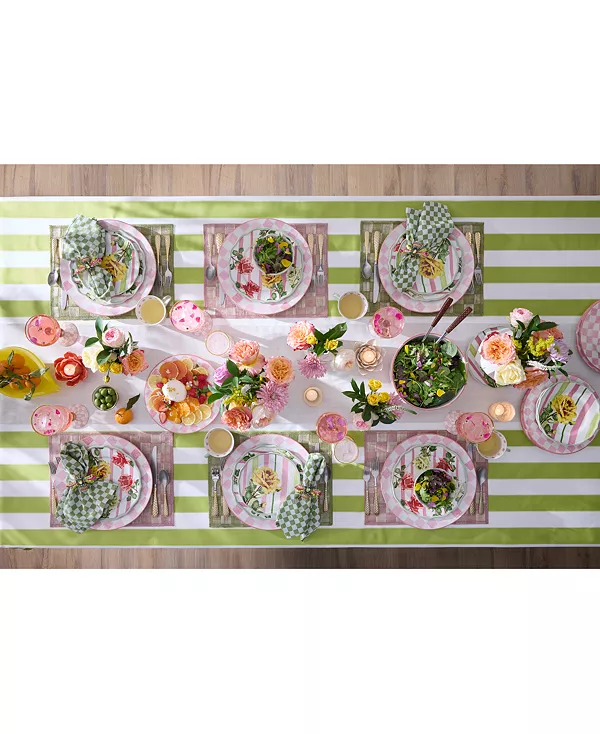 Украсьте стол этой салатной тарелкой из коллекции Mackenzie-Childs Garden Gala. Керамическое изделие украшено мягкими полосками и яркими цветочными узорами.