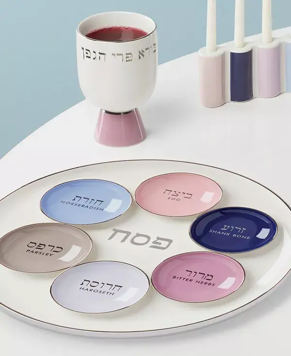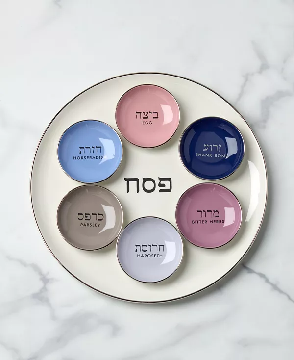 Независимо от того, устраиваете ли вы седерный ужин с семьей или дарите дорогой подарок близкому человеку, эта обновленная версия традиционной седерной тарелки наверняка будет храниться в памяти долгие годы. В центре написано слово «Песах» на иврите. Шесть тарелок меньшего размера украшены ивритскими и английскими словами, обозначающими предлагаемые на них блюда, и добавят ярких красок на стол.