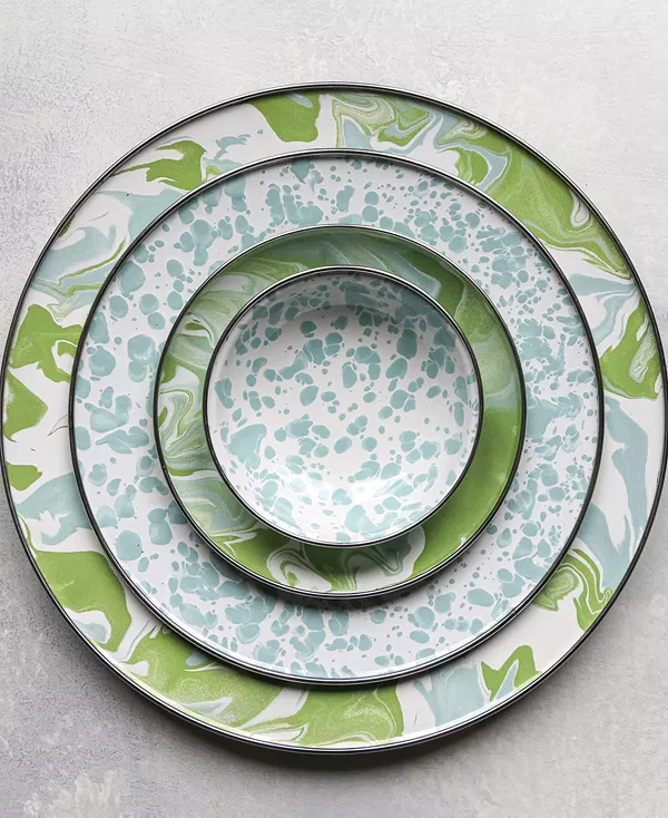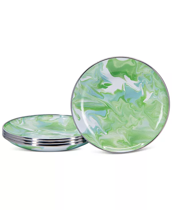 Динамичные цветовые завитки придают мраморный вид этому набору тарелок для закусок из коллекции Modern Monet от Golden Rabbit. Идеально подходит для вечеринок и пикников. Каждая тарелка вручную покрыта фарфоровой эмалью, что создает уникальные вариации цвета и узора. Отделка из нержавеющей стали придает элегантный завершающий штрих.
