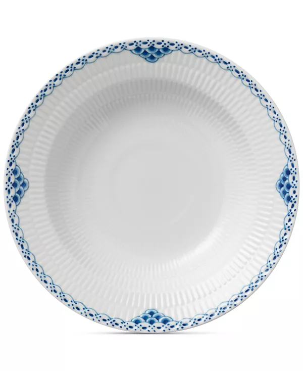 Романтичная суповая миска Princess от Royal Copenhagen, украшенная тонким кружевным узором, расписанным вручную синим цветом по рифленому краю, предлагает элегантный способ подать изысканные рагу и супы семье и гостям.