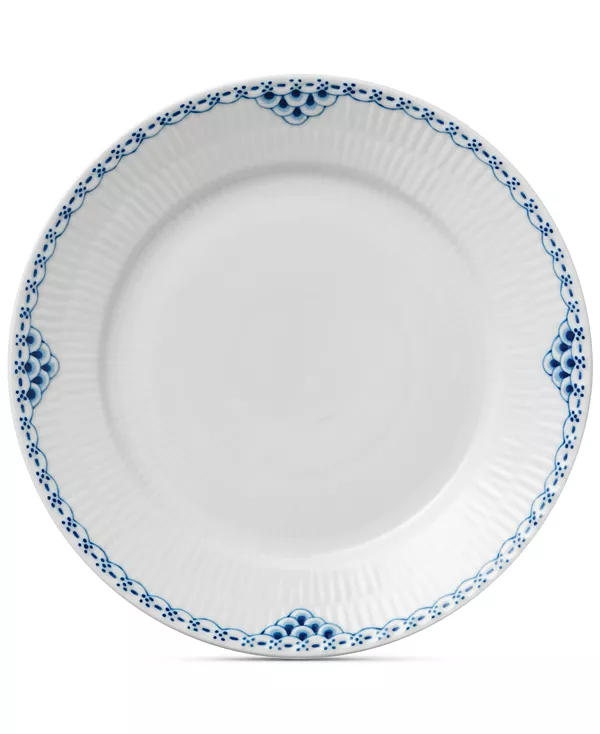 Добавьте романтики к листовой зелени, поданной на салатной тарелке Royal Copenhagen Princess. Дизайн тарелки, вдохновлённой чайным сервизом XIX века, обрамлён тонким кружевным узором, нанесённым вручную синим цветом на рифлёный белый фарфор.