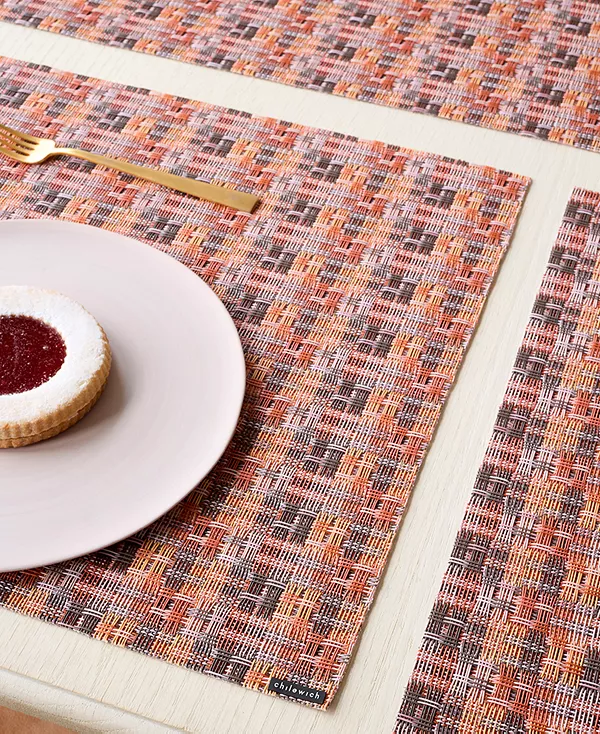 Богатая текстура особенно выделяется на фоне коврика Fable от Chilwich, где ступенчатая плотность и многоцветные цвета создают многогранные полосы. Этот динамичный дизайн напоминает текстиль ручной работы, созданный путем сбора кромки ткани Chilewich на фабрике и плетения лентовидных полос в уникальные изделия.