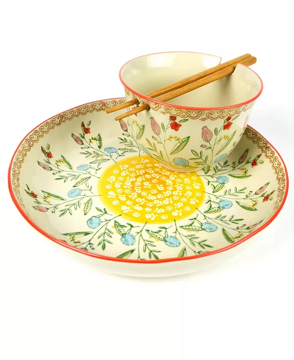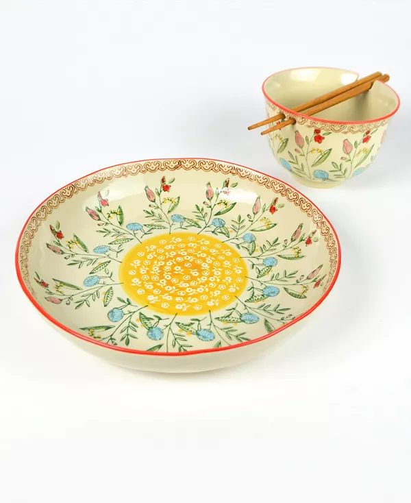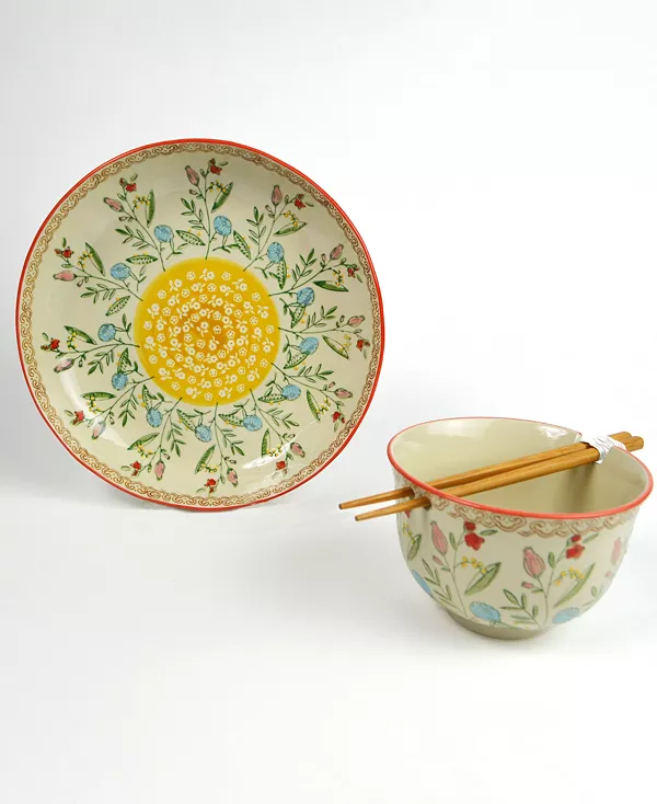 Набор мисок для рамен и ужина Ella одновременно красив и практичен. Прекрасные цветочные узоры коллекции Ella напоминают традиционные печатные узоры санганера на индийских тканях. Каждая чаша имеет уникальный дизайн и расписана вручную и доработана опытными мастерами. Высокая чаша для рамен отлично подходит для блюд из лапши и риса, а также для хлопьев. Она поставляется с парой многоразовых деревянных палочек для еды и имеет подставку для них сверху. Большая чаша идеально подходит для блюд, супов и рагу, а также для сервировки. Коллекция мисок Ella включает набор из двух мисок для рамен с красным или бирюзовым ободом с соответствующими цветочными мотивами, а также набор из трёх мисок для хранения.