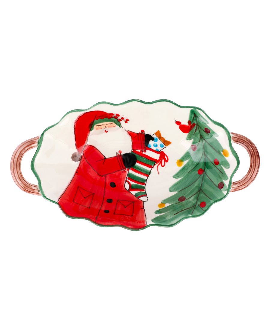 Фирменная праздничная коллекция VIETRI создана на основе детских воспоминаний мастера-ремесленника Алессандро Таддеи о сказках, которые ему читала мама о Баббо Натале, итальянском Санта-Клаусе. Алессандро передает свои любимые сцены из этих историй через свои причудливые узоры на овальной чаше с ручкой в виде Старого Святого Николая.