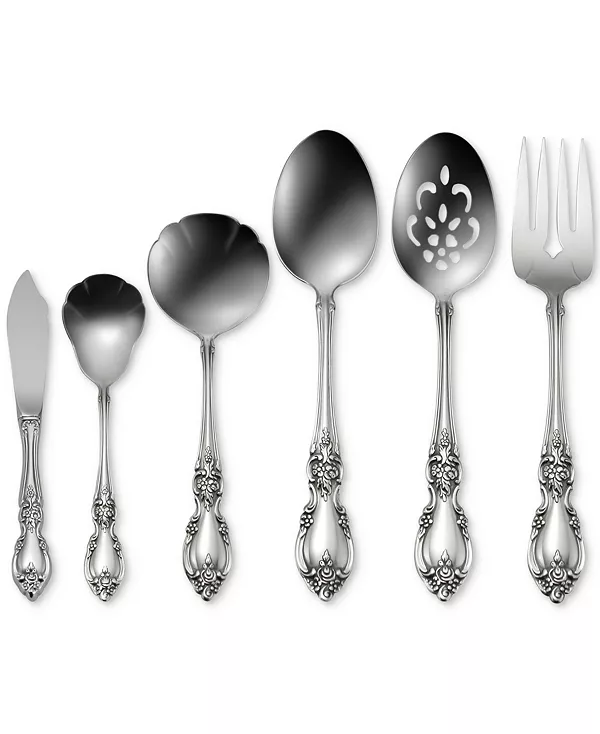 В комплект входят: сервировочная ложка 9 дюймов, сервировочная ложка с перфорацией 9 дюймов, половник для соуса 8,75 дюйма, сервировочная вилка 9 дюймов, нож для масла 6,75 дюйма и ложка для сахара 6 дюймов.