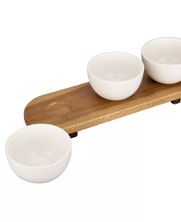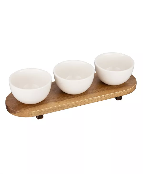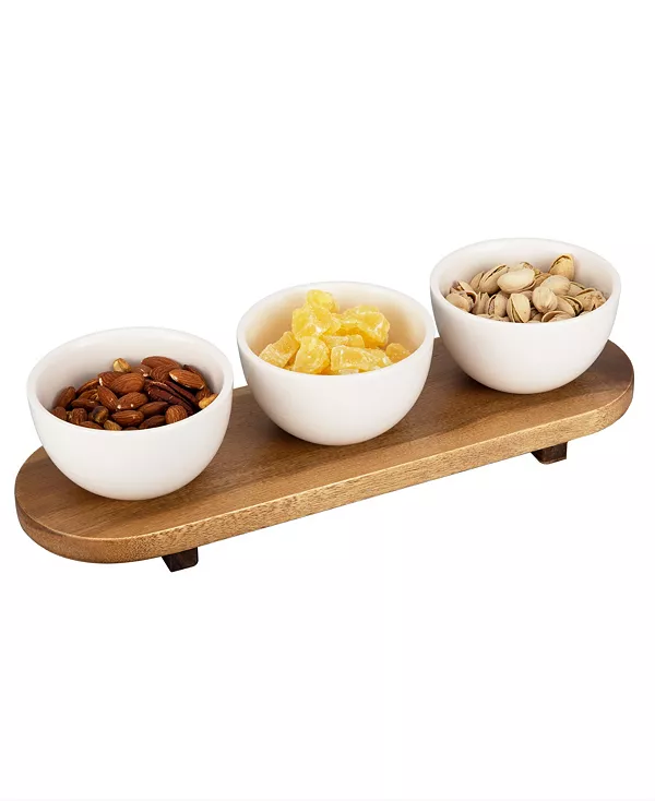 Этот набор из 4 предметов идеально подходит для орехов, закусок или приправ на вашем праздничном столе. Он включает в себя 3 миски с глянцевой и матовой отделкой на подносе из дерева с богатой текстурой и ножками.